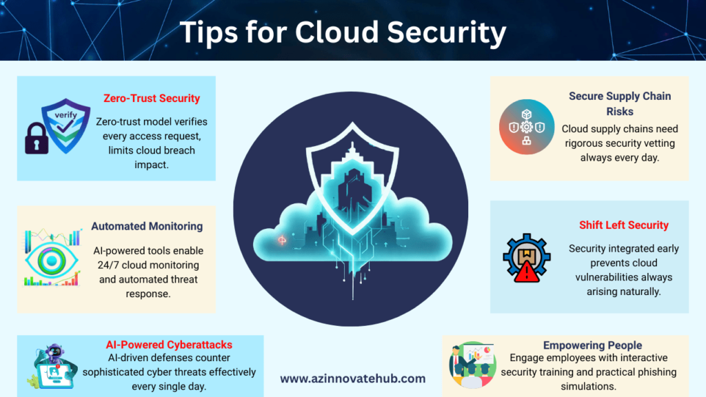 Cloud cybersecurity shield protecting data from AI attacks, misconfigurations, and supply chain risks with zero-trust and continuous monitoring, featuring a futuristic fortress and cyber threat arrows, by AZ Innovate Hub.